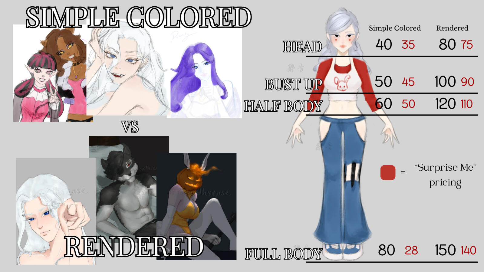 • Commission types may have a special "Surprise Me" pricing. The pricing may be higher or lower than the base price depending on commission type, but I will come up with everything and you will only receive the final product. This is also referred to as a "Skeb"-type commission.